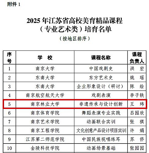 【南林新闻中心讯】近日,省教育厅公布了2025年江苏省高校美育精品课程(专业艺术类)培育名单。此次评选共收到全省85所高校申报课程134门,最终遴选30门课程进入培育名单。伟德家居与工业设计学院教授王玮课程团队申报的《非遗传承与设计创新》成功入选。