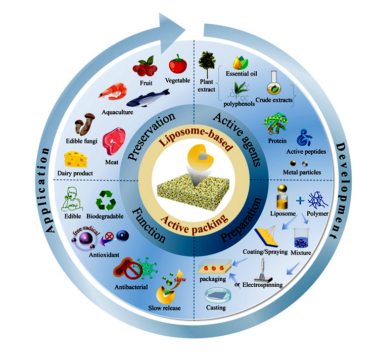 本文概述了活性包装中可被脂质体包封的活性物质类型,并阐明了这些活性物质稳定负载于脂质体的作用原理;总结了脂质体基活性包装的制备技术、作用机制及关键影响因素;此外,还阐明了脂质体对包装材料理化性质的积极影响。同时,本文深入探讨了脂质体基活性包装在食品保鲜体系中的抗菌、抗氧化机制及控释原理,并综述了其在多种食品保鲜中的应用效能。通过深入探讨,本研究力求为开发更具创新性、环保性和高效性的活性保鲜包装提供解决方案,进而满足食品工业不断发展的需求。