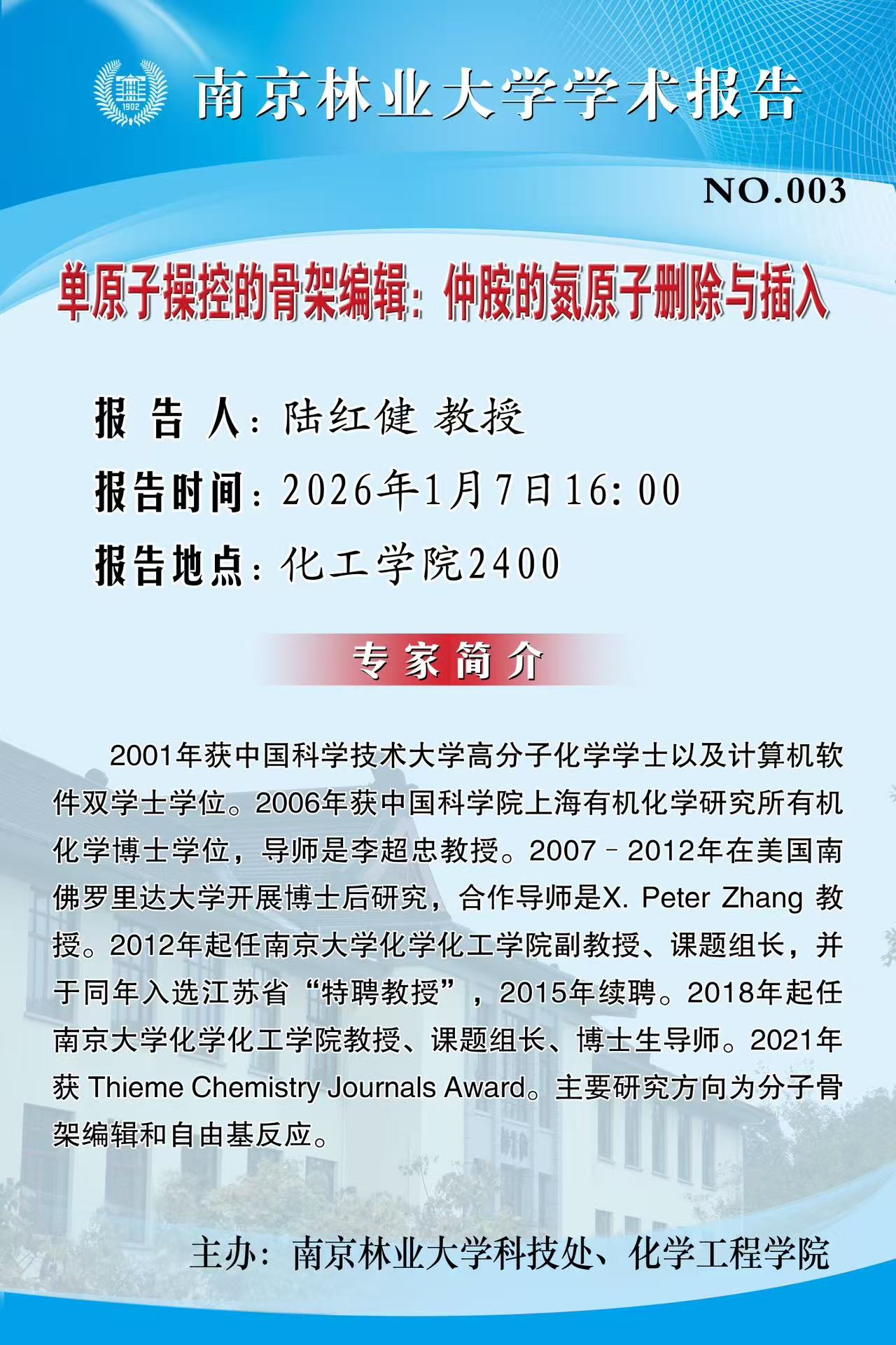 活动预告 首页 -活动预告 单原子操控的骨架编辑:仲胺的氨原子删除与插入 来源:通讯员:摄影:【报告人】陆红键 教授 【报告时间】2026年1月7日16:00 【报告地点】化工学院2400编辑:浏览:时间:2026-01-08 字号:【大中小】