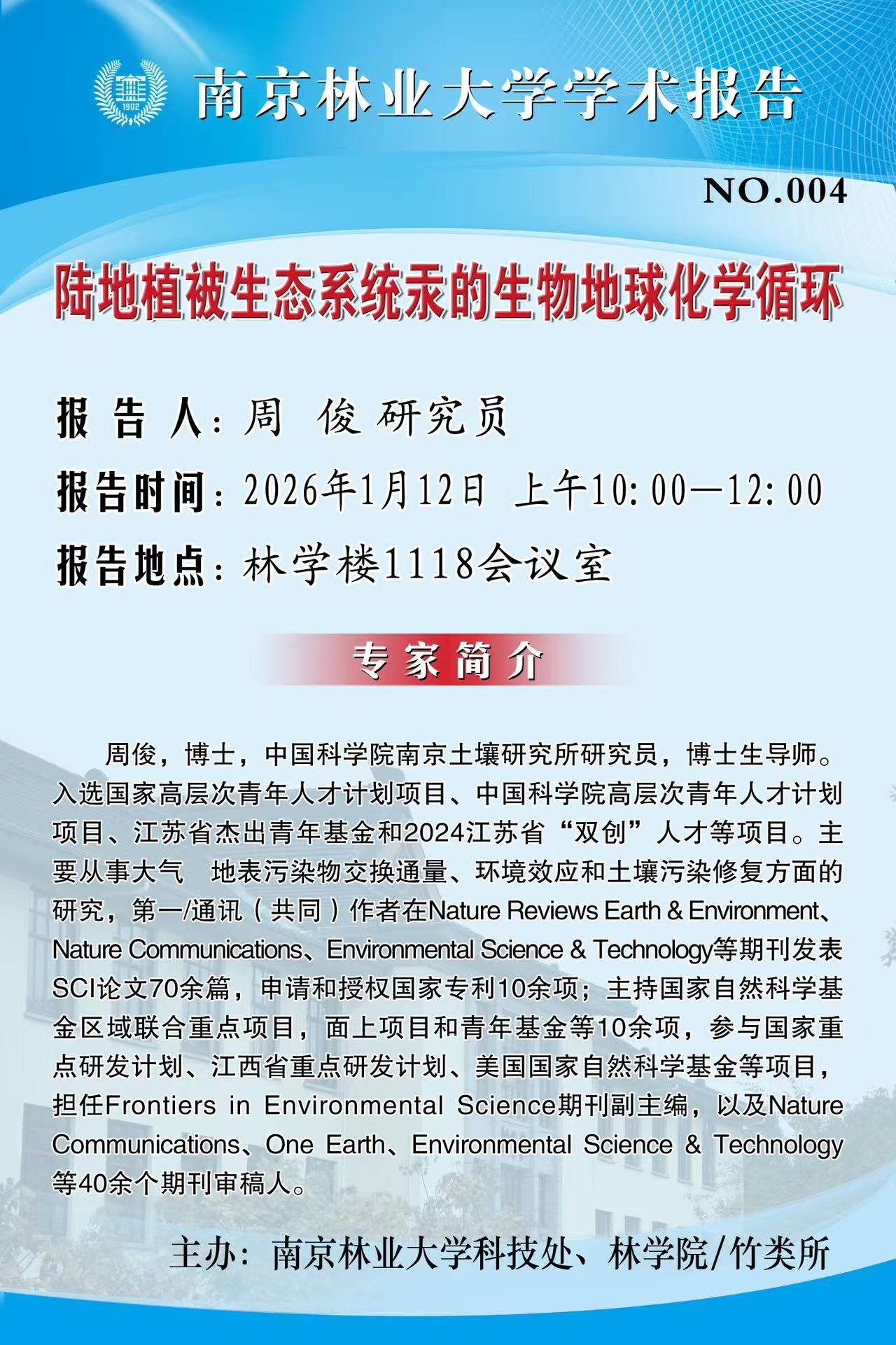 活动预告 首页 -活动预告 陆地植被生态系统汞的生物地球化学循环 来源:通讯员:摄影:【报告人】周 俊 研究员 【报告时间】2026年1月12日上午10:00-12:00 【报告地点】林学楼1118会议室编辑:浏览:时间:2026-01-08 字号:【大中小】